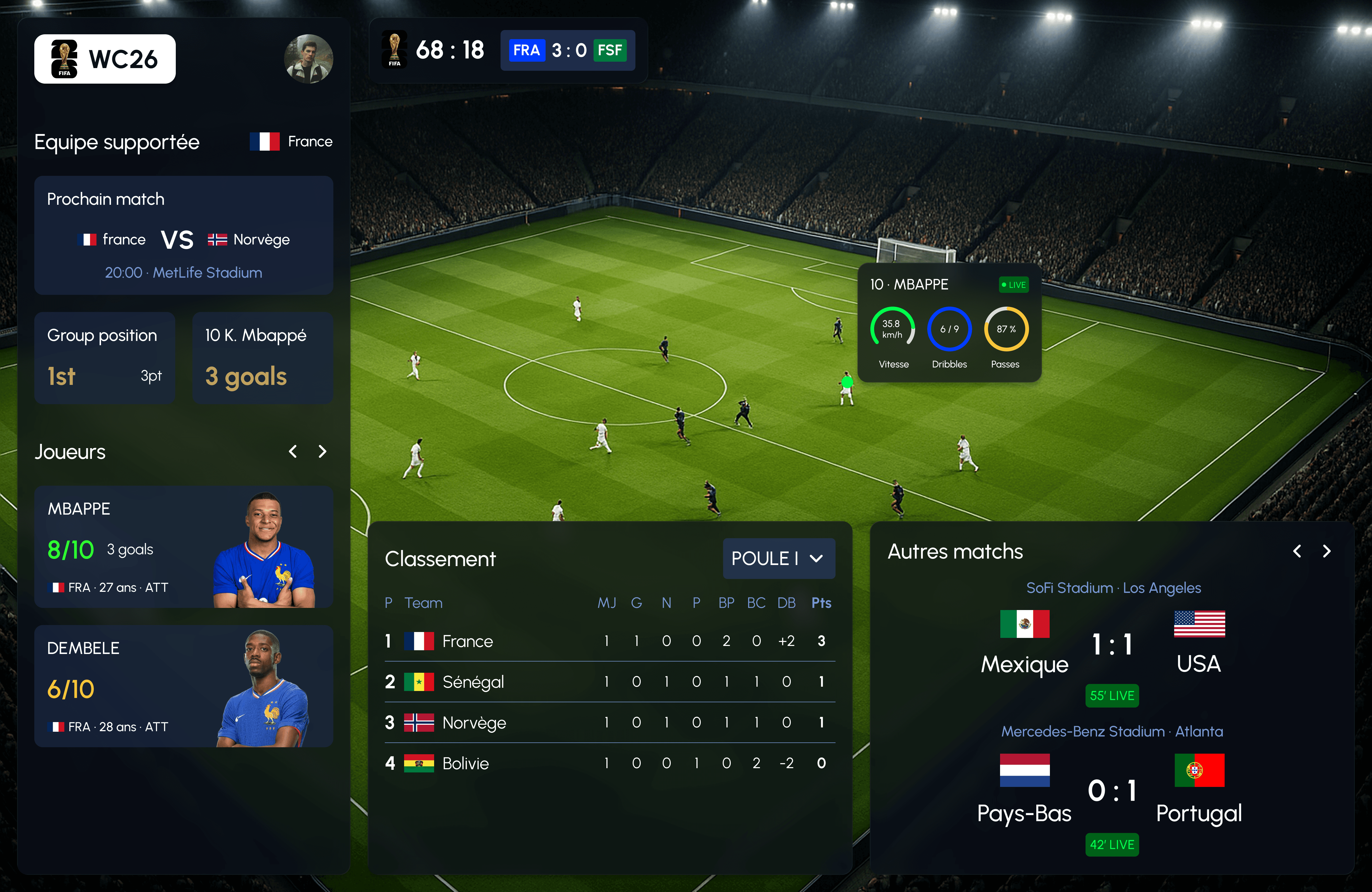 WC26 Control intègre un suivi individuel des joueurs clés, avec des indicateurs de performance tels que la vitesse, le dribble et la qualité de passe. Ces données sont présentées sous forme de widgets visuels simples et dynamiques, permettant d’enrichir l’expérience de match par une lecture plus analytique. L’objectif n’est pas de surcharger l’interface, mais d’apporter un niveau d’information supplémentaire compréhensible aussi bien par un passionné que par un spectateur occasionnel.