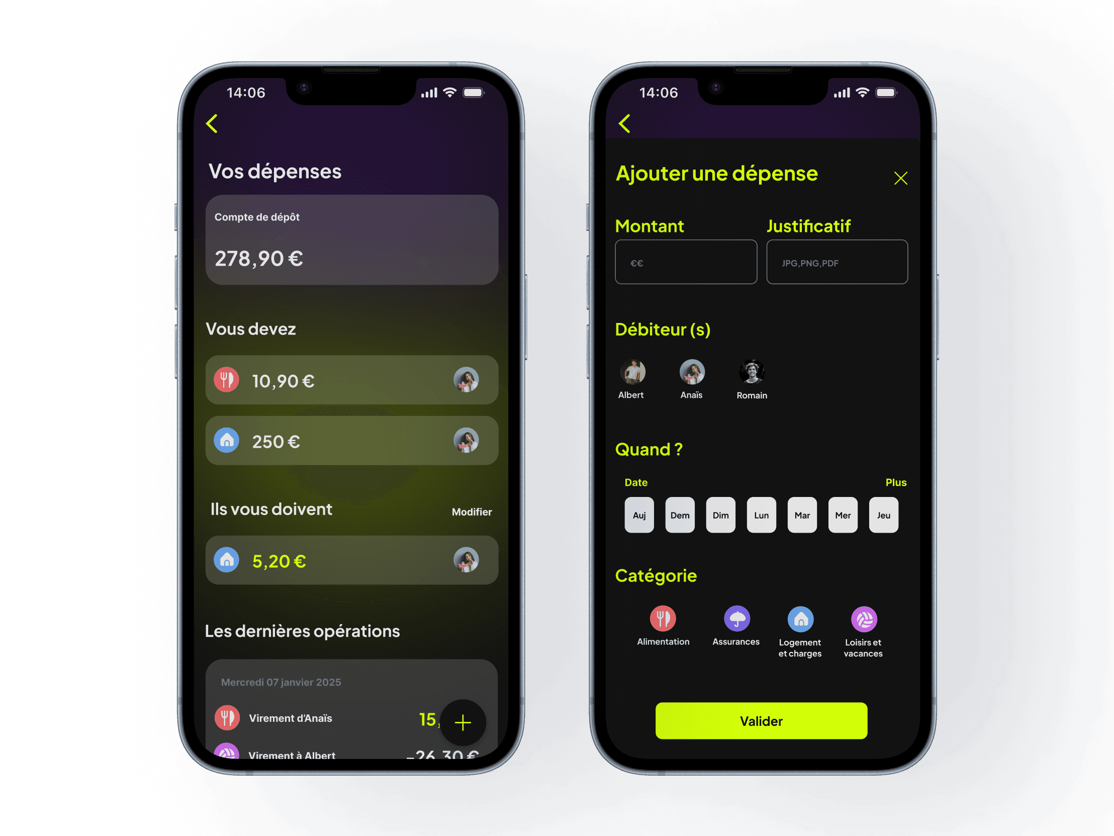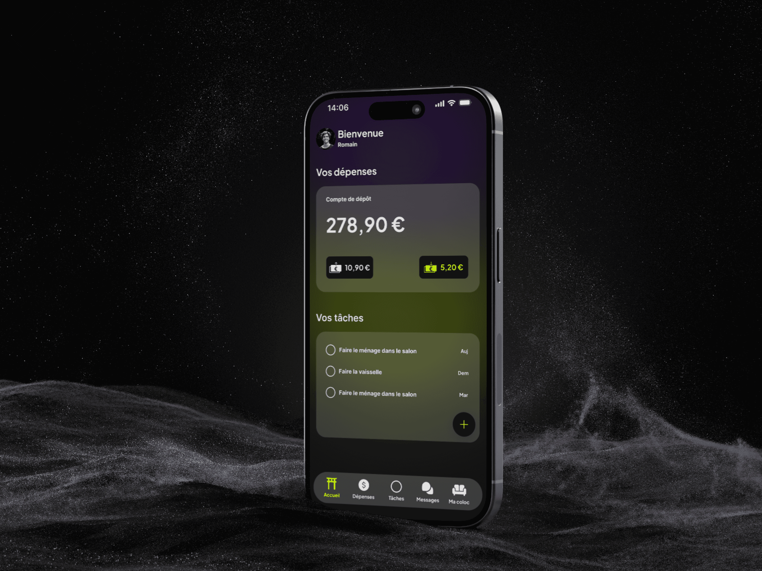 L’application propose une navigation simple et rapide, avec des sections bien définies pour planifier les tâches communes, répartir les dépenses et suivre les paiements en temps réel. Chaque fonctionnalité est pensée pour répondre aux besoins des utilisateurs.