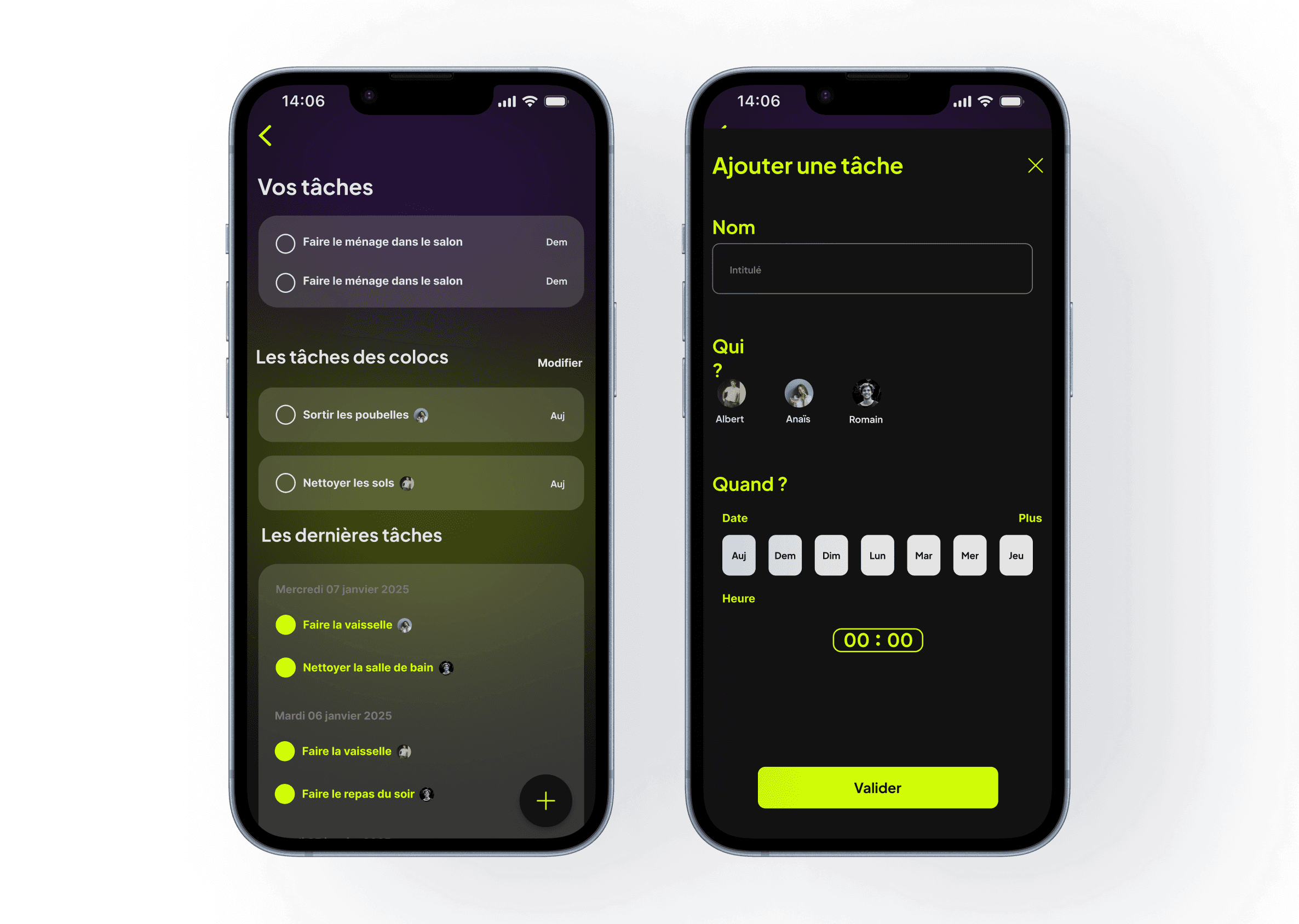 L’interface a été conçue pour être claire et accessible, avec des fonctionnalités permettant de gérer les tâches, les dépenses et la communication entre colocataires. Les écrans sont épurés et organisés pour offrir une expérience fluide et agréable.
